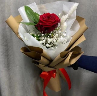 Волшебный букет "Элегантный Поцелуй" представляет собой роскошную композицию из одной розы, украшенной легкой и изящной гипсофилой. Этот букет идеально подходит для выражения нежных и романтических чувств.