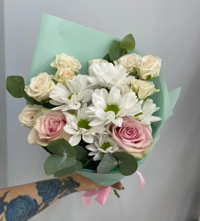 Насыщенный аромат роз и хризантем, словно сочетает в себе все нежное и изящное. Белоснежные и розовые лепестки букета раскрываются, словно медитативный миг вечности. Упаковка из крафтовой бумаги создает ощущение природной простоты и непосредственности, словно букет только что был собран на полях. "Орион" добавит немного чарующей элегантности в вашу жизнь.
